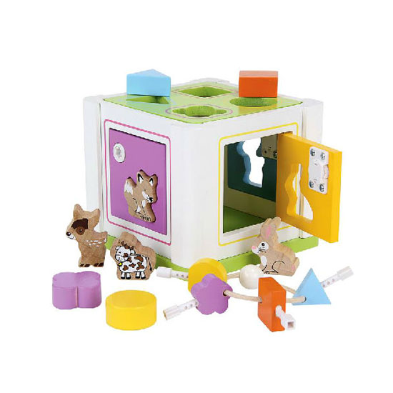 This lock and shape sorting box comes in a cuboid shape. Babies can put the shape blocks, animals and keys into the box through the corresponding holes. The blocks are finely polished with smooth surfaces for added safety.