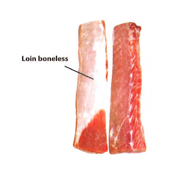 Displayed is a piece of loin pork that is lean and is in a healthy red color. The pig is fed professionally so that the meat is safe and not fat for your assurance. This high quality loin pork is trimmed boneless so that it is easy to prepare.