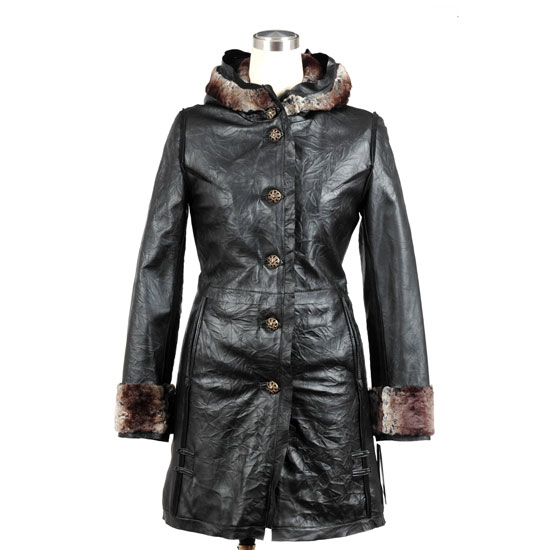 This coat offers wearers a modish style with a solid ebony layout. Its front comes with a row of artfully crafted buttons. This piece is also accented by its collar and cuffs with a contrasting design.
