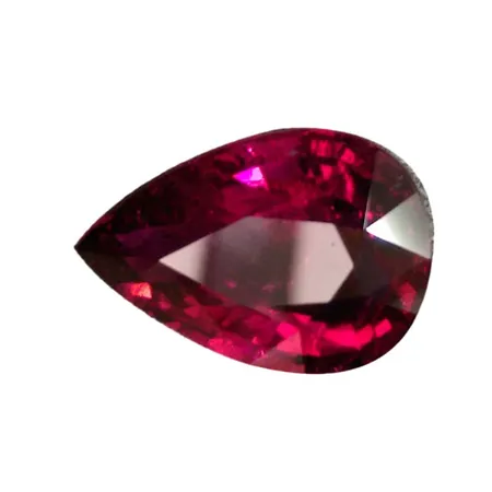 Displayed is a 25-carat rubellite coming in a blood red color. It is shaped into a pear cut for ultimate sparkle and shine. It is ideal for mounting on bracelets, earrings and finger rings.