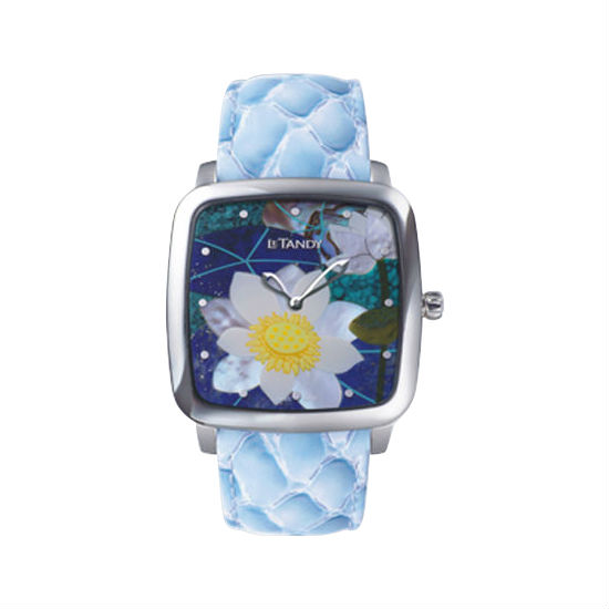 Housed in a rectangular stainless steel case, this quartz watch features a gemstone analog face crafted with intricate lotus flower motifs on the dial. It is further completed with a textured leather strap to boast an elegant and sophisticated style.