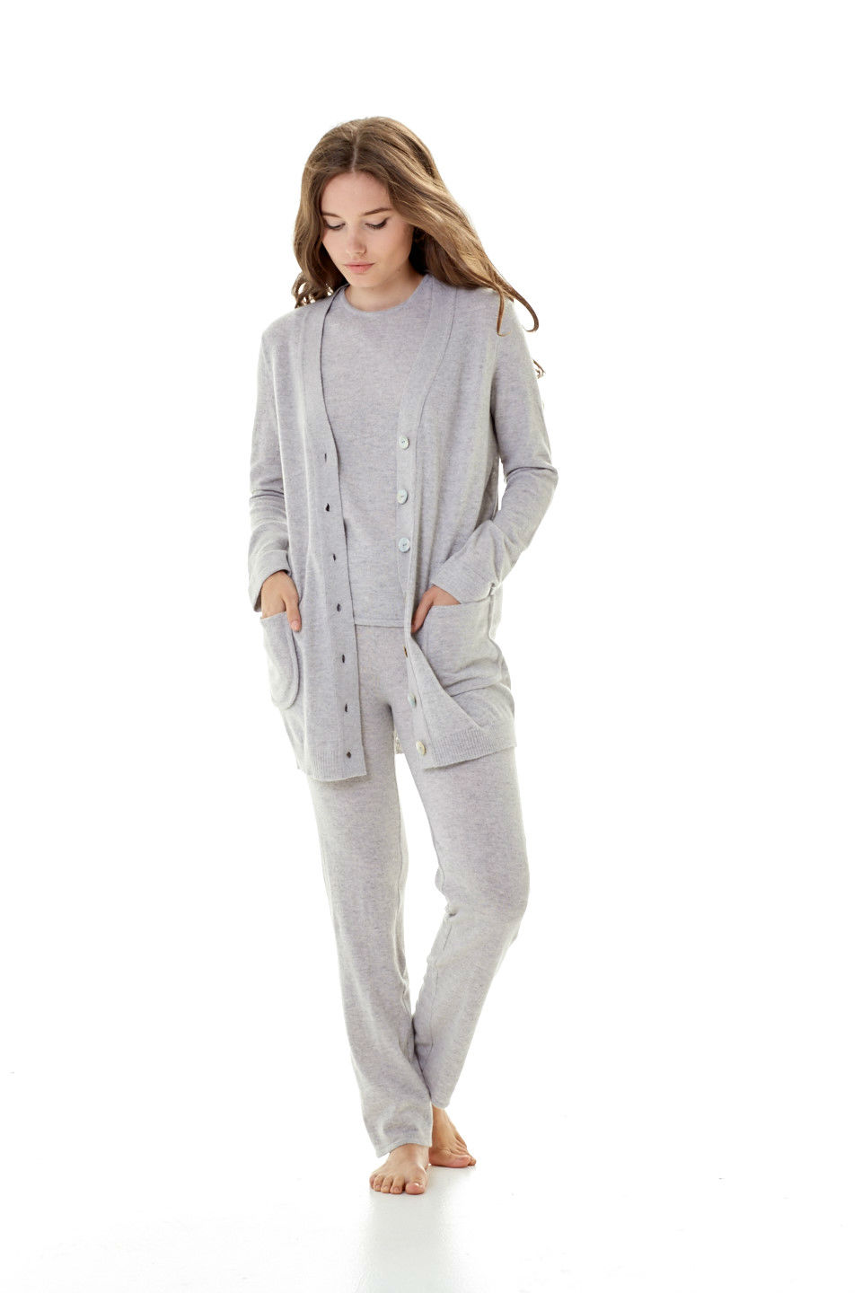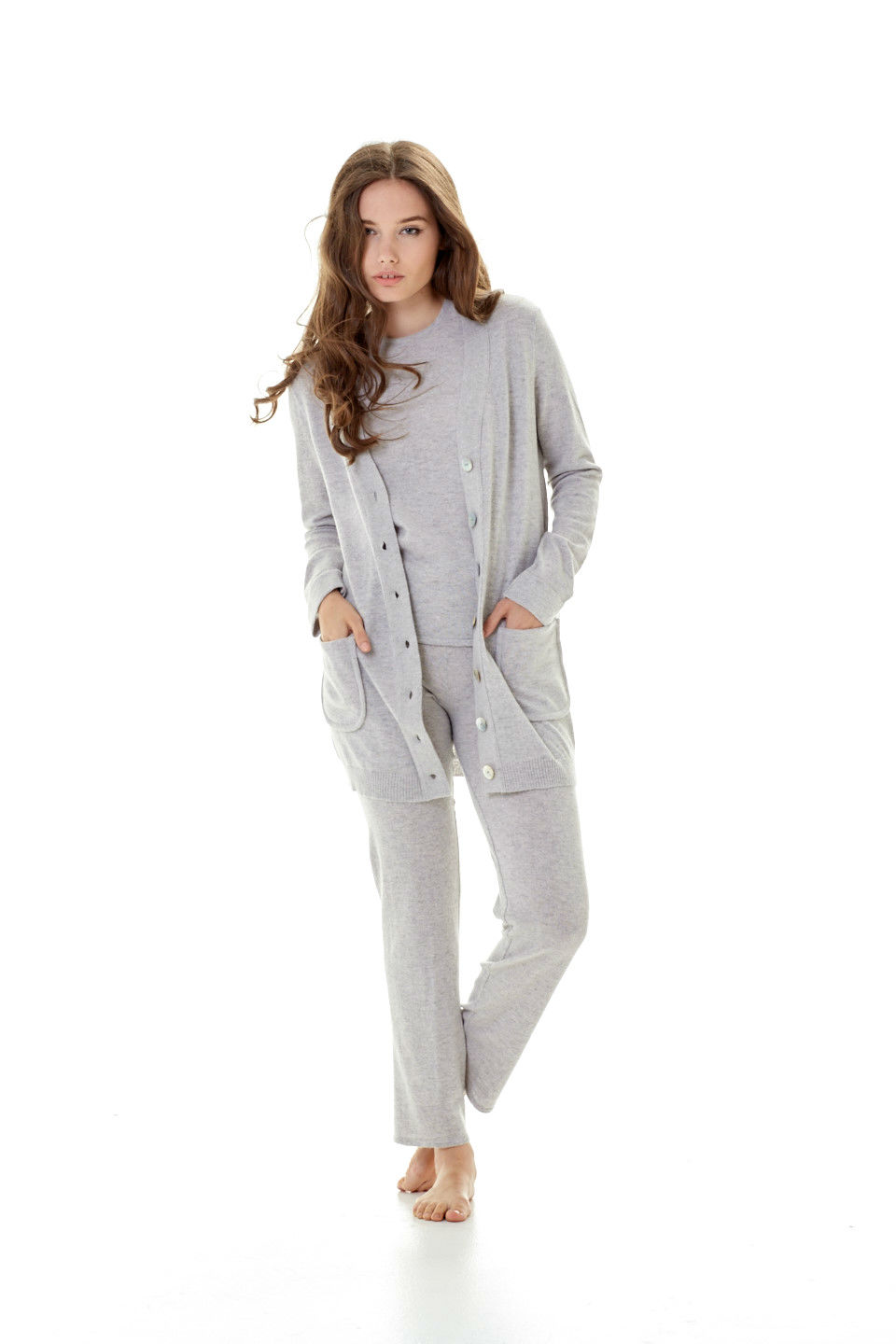 Lounge /Homeware set consist of cardigan, trousers and sleeveless top and mashine knitted in Europe, Latvia from high quality Italian yarn (55% cashmere and 45% extra fine merino wool). This lounging three peices set is ideal for home and comfortable travel. For example during the long haul flight. Available in colours on a colour card