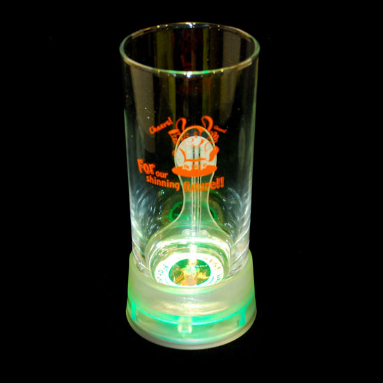 The picture displays a transparent coaster in a circular shape. The novel coaster is fitted with a small LED inside and can emit green light. Add more fun to your desktop with this luminous coaster.