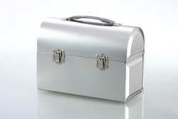 Tin made lunch box with classic silver design with two lock up buckles on the side and a strap handle on the top. This lunch box is a perfect place for putting sandwiches,cookies and biscuits in which is durable and light.