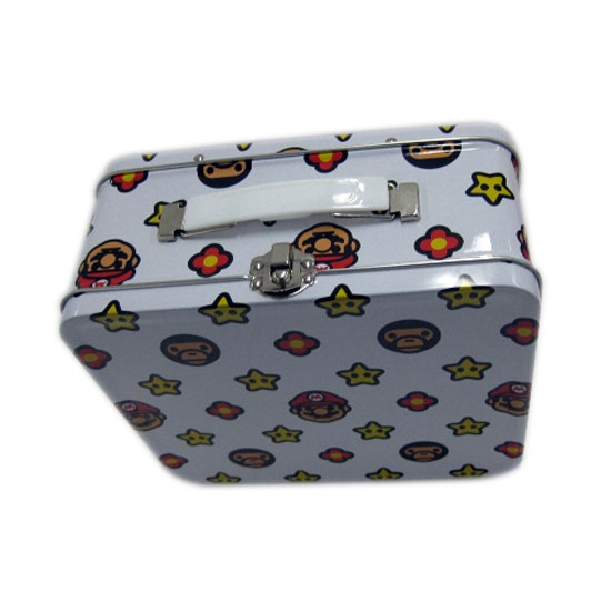 Displayed here is a stylish lunch box with a locker. The tin construction allows durable use. This outlined tin box comes with a handle for easy holding.