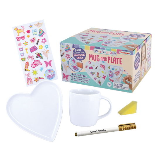 Create your very own plate and mug with super fun waterproof crystal stickers! This set includes 1 heart plate, 1 mug, 1 waterproof crystal sticker, 1 sponge, and 1 marker.