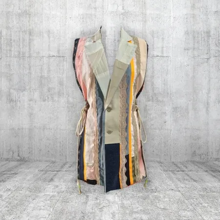 Sleeveless patchwork vest with a belted waist, combining earthy tones and exposed seams.