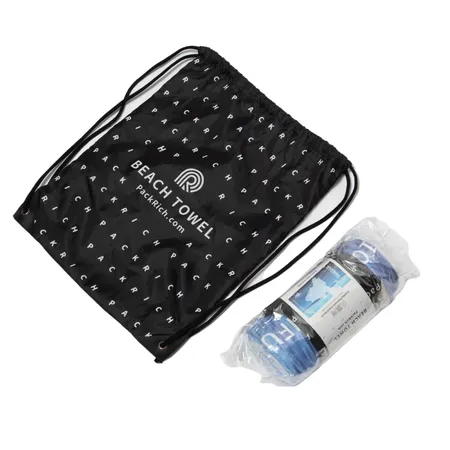 Detail Overlock edge,one hanger hook and care label. with 170gsm matte paper card and 37x42cm backpack wrap the beach towel