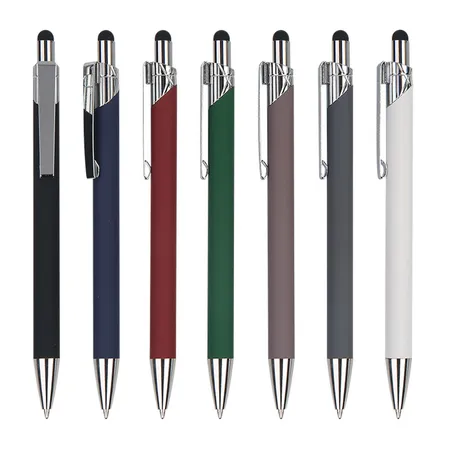PUSH ACTION METAL BALL PEN, RUBBERIZED COLOURED BARREL. CHROME PLATED CLIP, TIP AND PUSH BUTTON, TOUCH SCREEN STYLUS ON PUSH BUTTON, 1.0MM BLACK X-20 BALL PEN REFILL