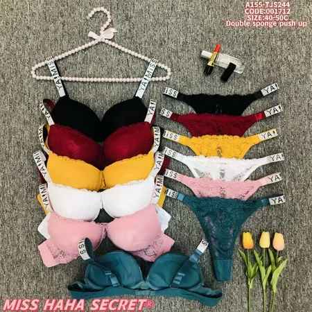 Indulge in the perfect blend of style and support with the MISS HAHA SECRET double sponge push up bra and lace panty set. Featuring double sponge push-up technology for enhanced lift and a collection of vibrant colors with delicate lace details, this set is designed to boost your confidence. Available in sizes 40-50C, it ensures a comfortable and tailored fit. The logo straps add a trendy touch, while the lace panties bring a hint of romance. Whether you prefer bold hues or soft tones, this set offers options to match your mood and style. Code: 001712, Style: A155-TJS244.
