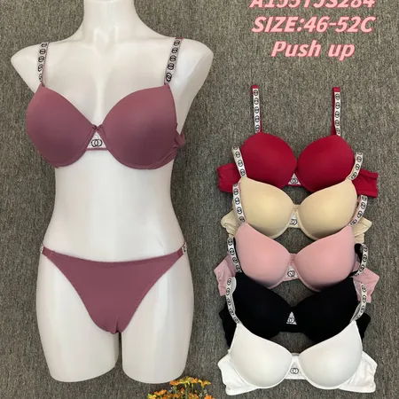 The MISS HAHA SECRET Push Up Bra Set combines style and lift seamlessly. Featuring push-up design for enhanced shape, it is distinguished by logo-patterned straps that add a trendy touch. Available in colors like mauve, red, beige, pink, black, and white, and sized 46-52C, this set includes a matching panty. It caters to those seeking a fashionable lingerie option that balances aesthetic appeal and wearability, ideal for both daily use and occasions where a chic look is desired.