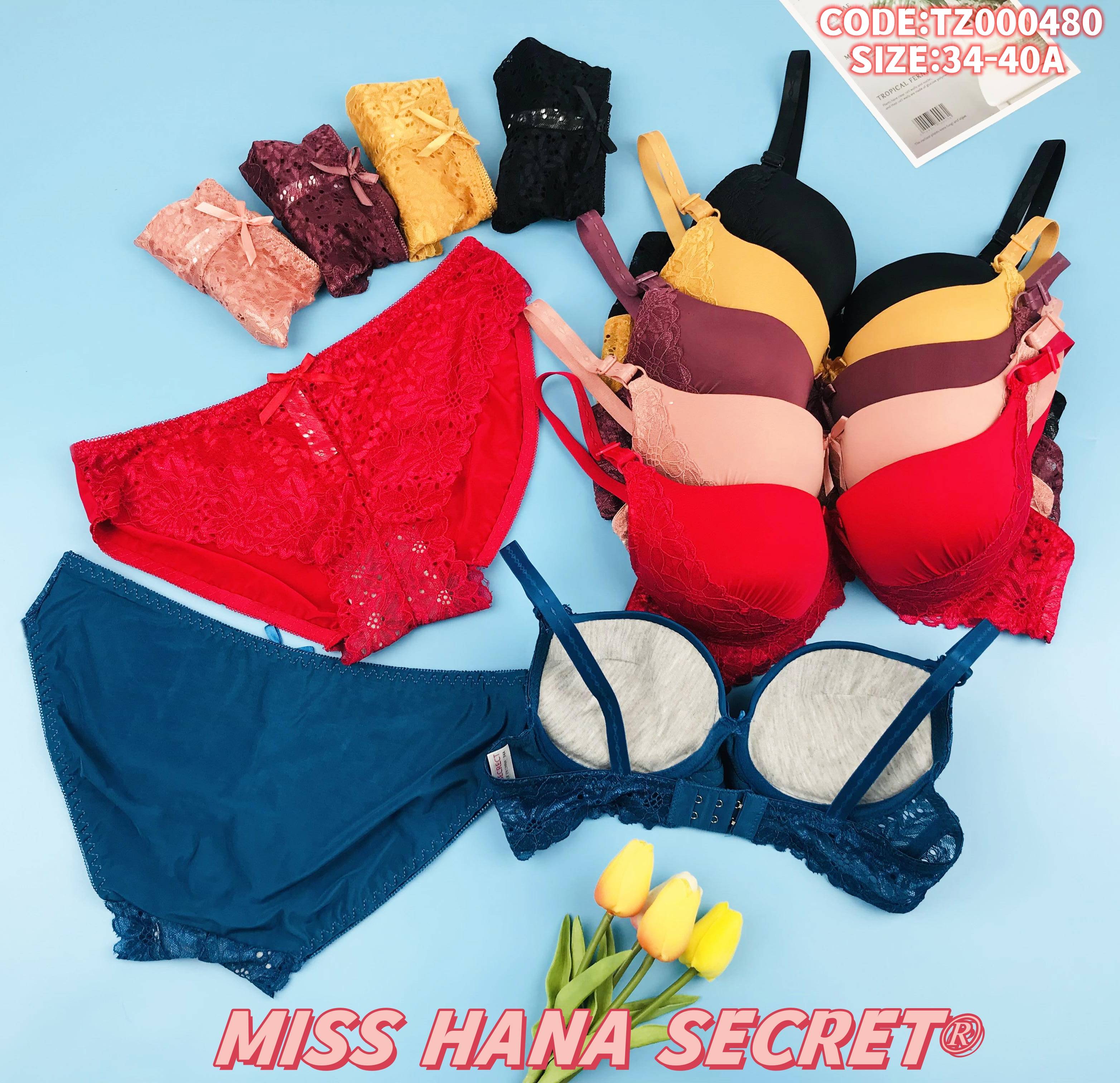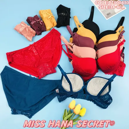 Indulge in the MISS HANA SECRET bra & panty set—where comfort, elegance, and versatility meet:Complete Lingerie Set: Includes a wireless bra + matching panty, designed with delicate lace details for a feminine, chic look.Wireless & Supportive: Soft, padded cups (no underwire) provide gentle lift and all-day comfort, perfect for daily wear or special occasions.Flattering Fit: Available in sizes 34-40A (code: TZ000480) with adjustable straps, ensuring a customized, secure fit.Vibrant Color Options: Choose from rich red, deep blue, soft pink, warm yellow, and classic black to match your style.Premium Fabric: Skin-friendly, breathable material with lace trim balances comfort and sophistication—ideal for everyday freshness.Elevate your intimate wardrobe with this stylish, comfortable set that combines practicality and charm.