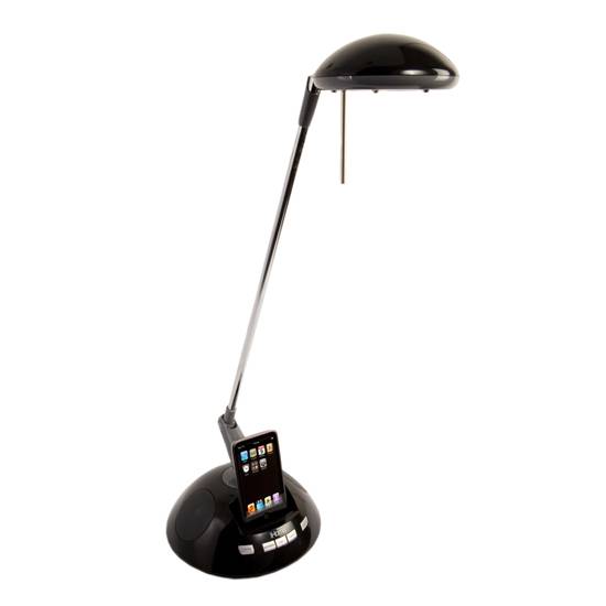 This product is a multi-functional MP3 dock lamp. It plays and charges mp3 players like iPods at 5 watts total output. It is designed with bass features and remote control. It is also features a halogen bulb (included), chrome buttons and a telescoping pole. White and black coloured products are available.