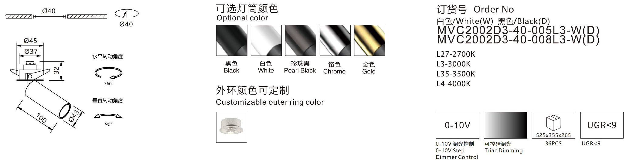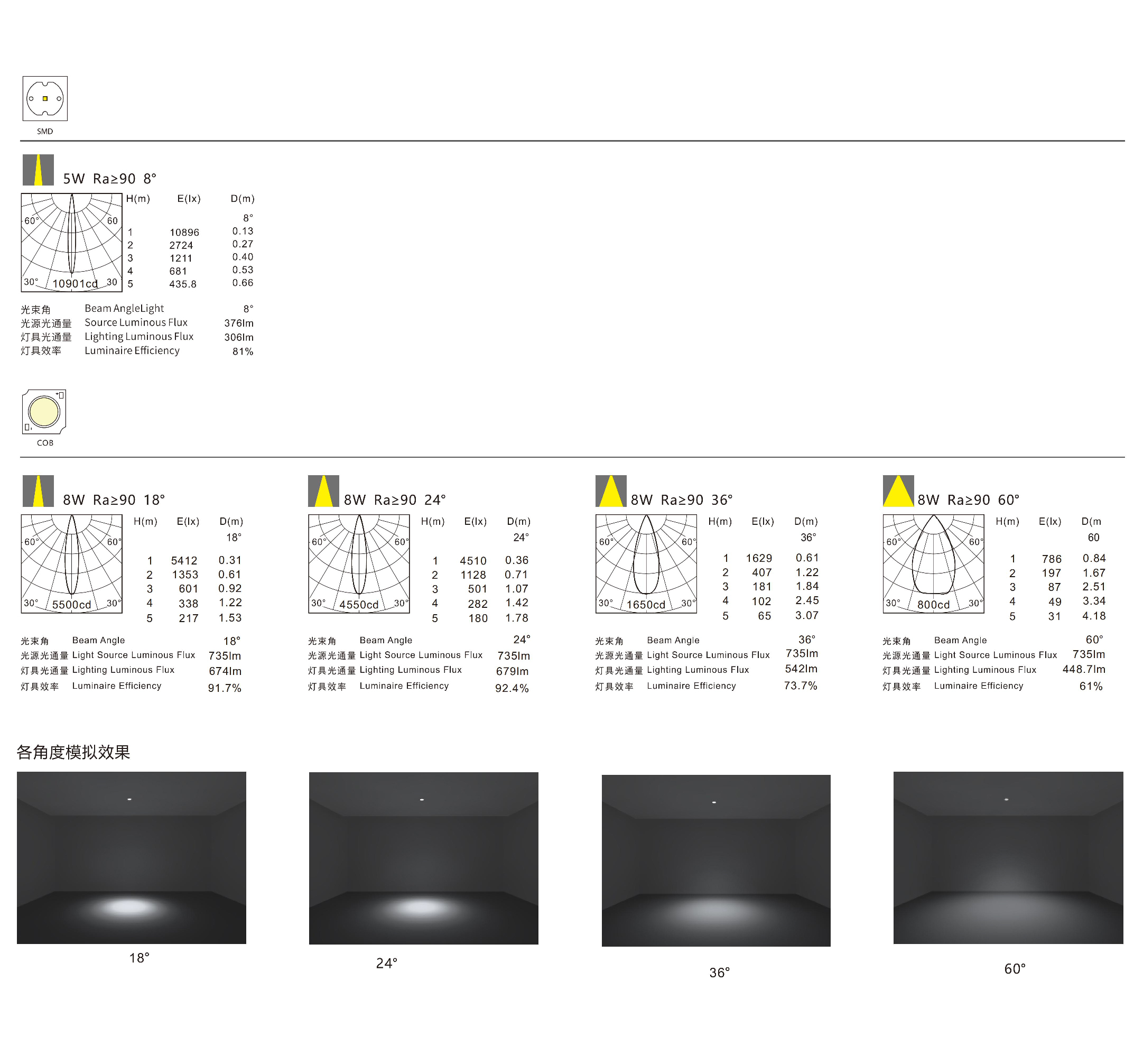 功率: 5W/8W色温: 2700K/3000K/3500K/4000K/5000K光束角: 8°, 12°, 18°, 24°, 36°, 60°