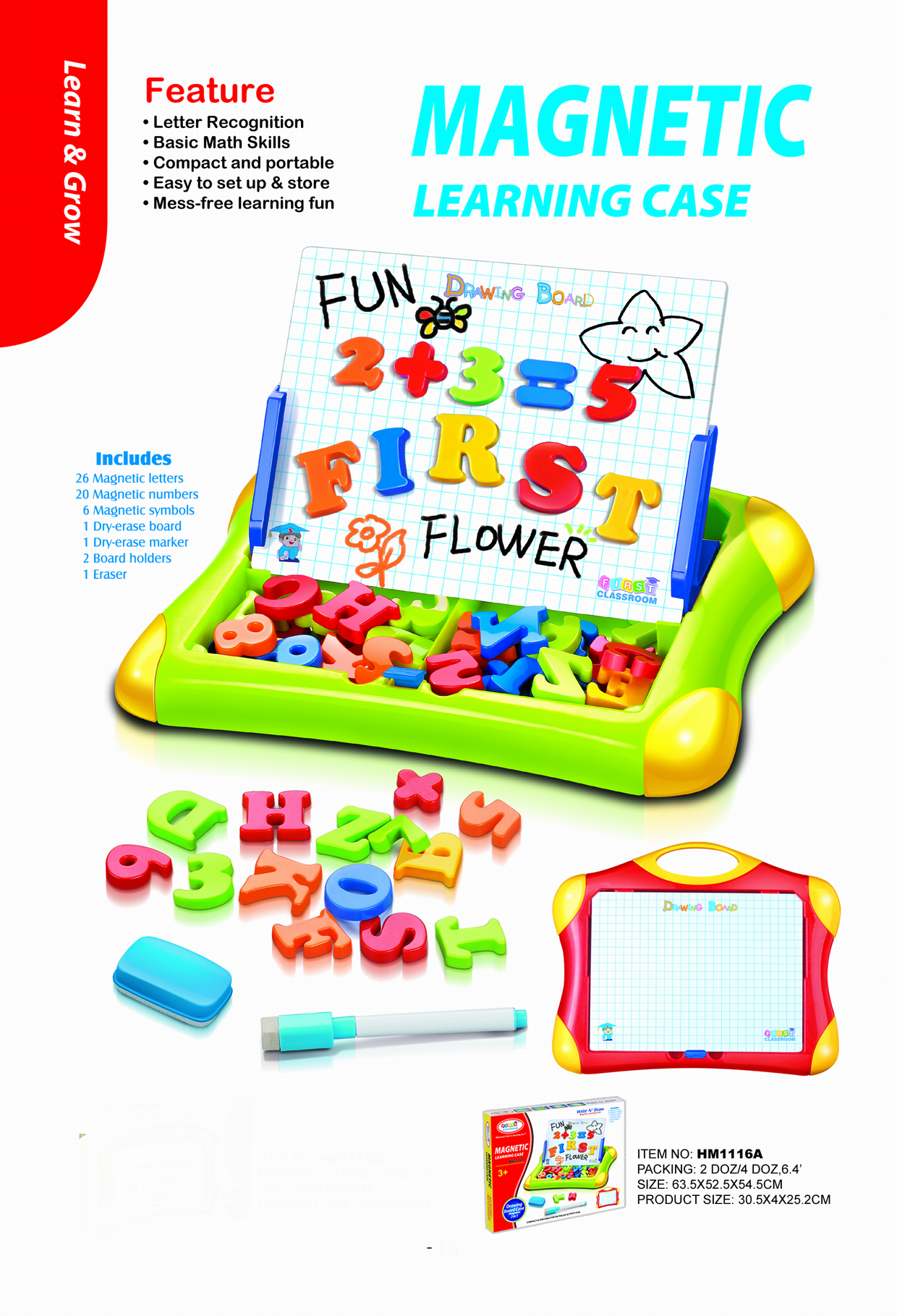 Magnetic Learning Case with 26 magnetic letters, 20 magnetic numbers, 6 magnetic symbols, 1 dry-erase board, 1 dry-erase marker, 2 Board holders, 1 eraser