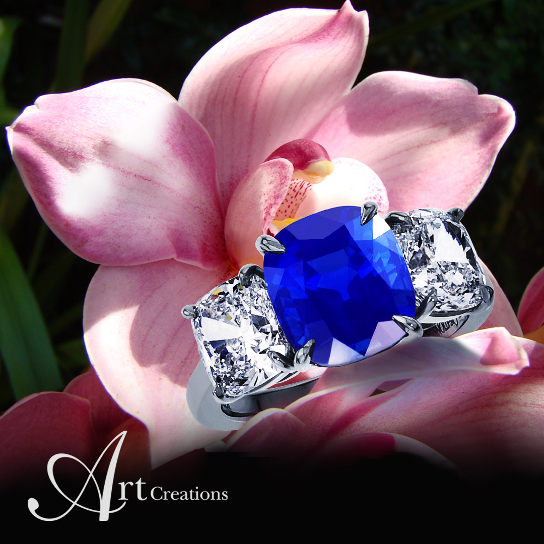 Set with a cushion-shaped sapphire, weighing 4.55 carats, flanked by cushion-shaped diamonds, weighing 3.05 carats total, mounted in platinum.