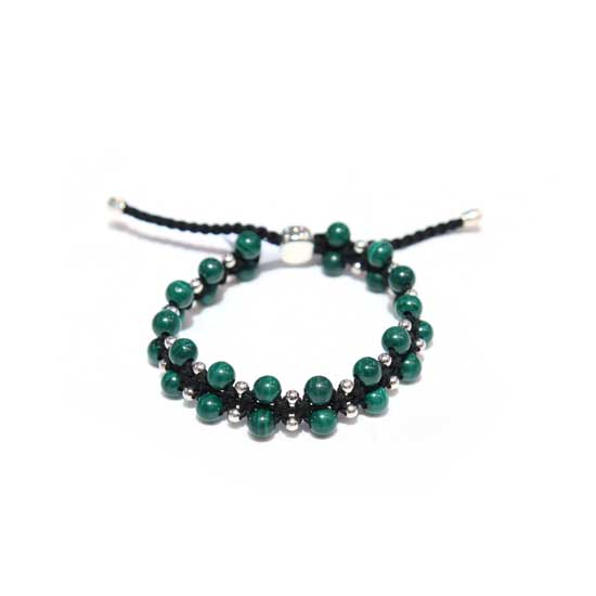 This elegant bracelet is braided from two rows of green malachite beads and tiny silver beads. The beautiful beads showcase a smooth, polished finish. The length of the bracelet is adjustable.