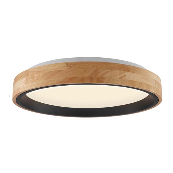 This is a circular ceiling light. The edge of the lamp body is made of spliced solid wood, presenting natural wood texture and warm color, with black elements in the middle, forming a contrast of color and material, full of design sense. The central light - emitting area can emit soft warm light. The overall style integrates natural and modern elements, suitable for installation in home spaces such as living rooms and bedrooms, and can create a warm and stylish lighting atmosphere, fitting home decoration styles like Nordic and Japanese styles that emphasize natural elements.