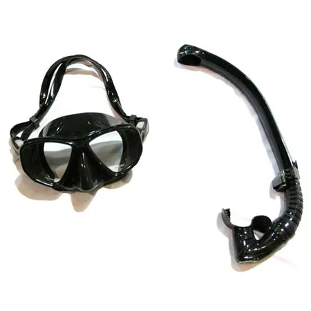 As shown is a diving set coming with a swimming mask and a snorkel. The lenses of the mask are made of tempered glass for guaranteed safety. The professional design is suitable for swimming and scuba diving.