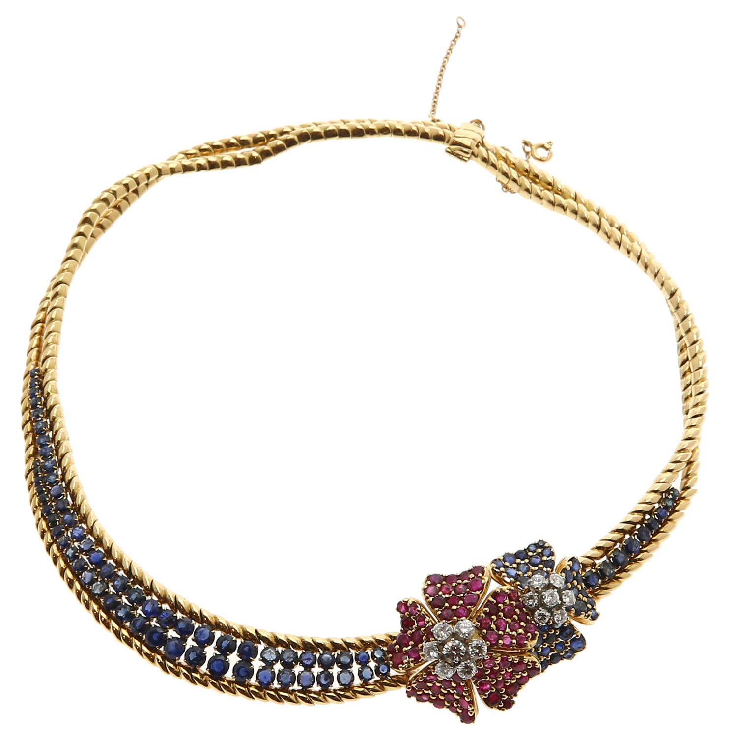 Antique necklace with 2 flowers articulated ornate of diamonds, sapphires and rubies (no heat)