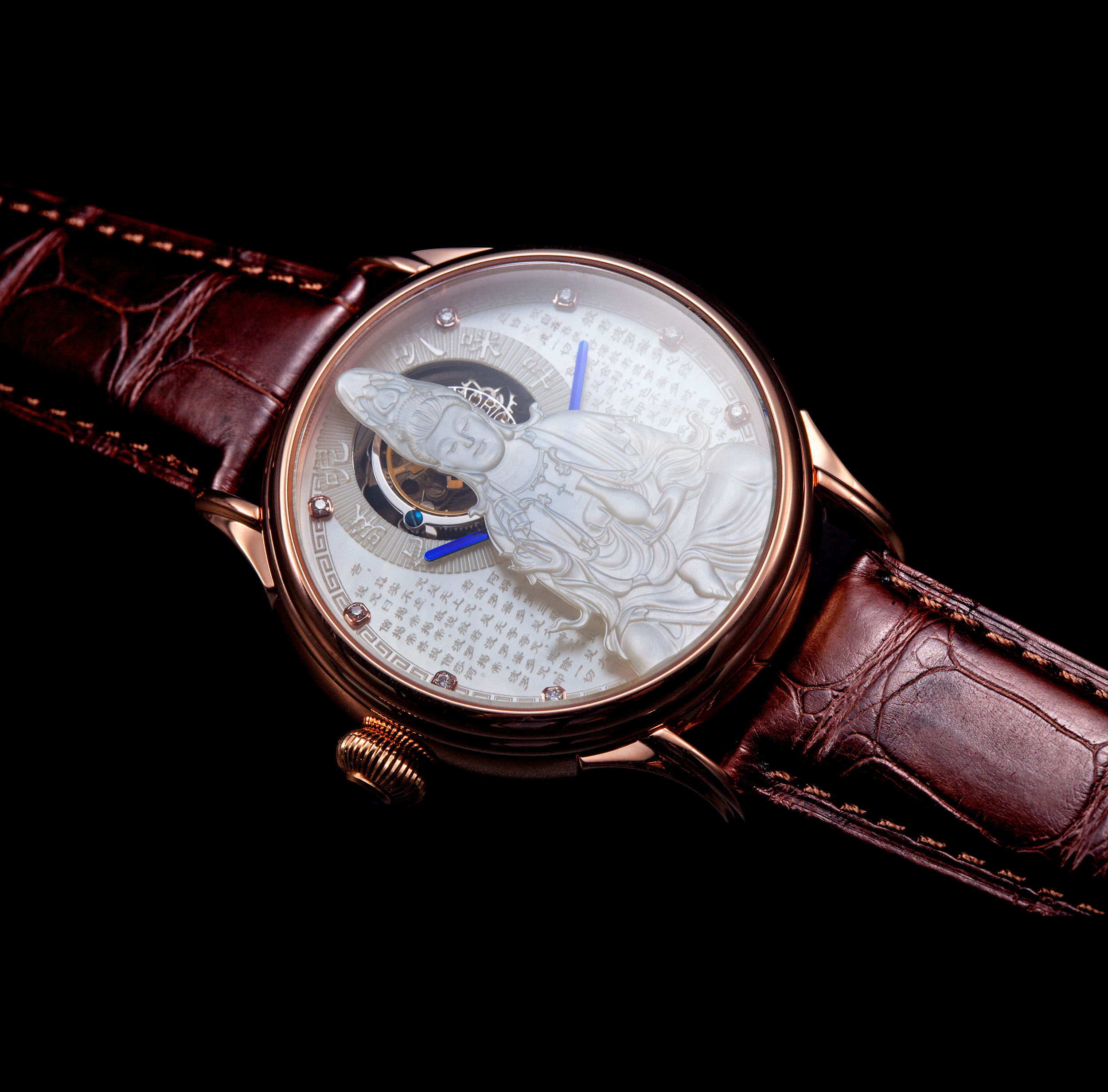 The displayed watch has a silver toned case and is adorned with the sculpture of Guanyin on the dial. It is meticulously crafted with Chinese sutras in the background and has a round tourbillion at 12H position. This elegant and refined watch delivers reliable accuracy and is excellent for using as a gift.