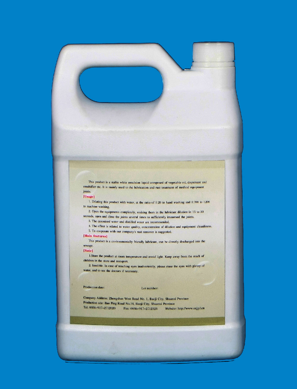 This product is a stable white emulsion liquid composed of vegetable oil, dispersant and emulsifier etc. It is mainly used to the lubrication and rust treatment of medical equipment joints.