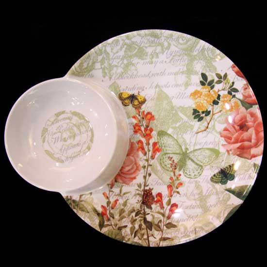 The plate is attached with a small bowl on the left for separating different food items. The floral patterns add a decorative touch to it. This plate serves as a great tableware item for household and restaurant use.