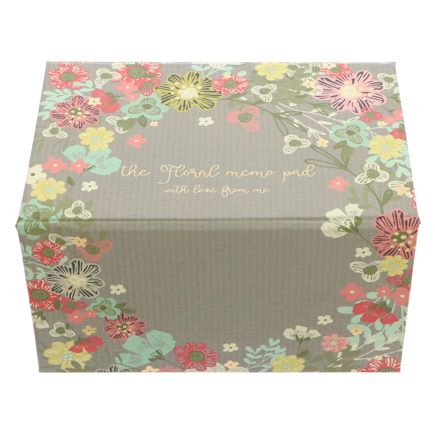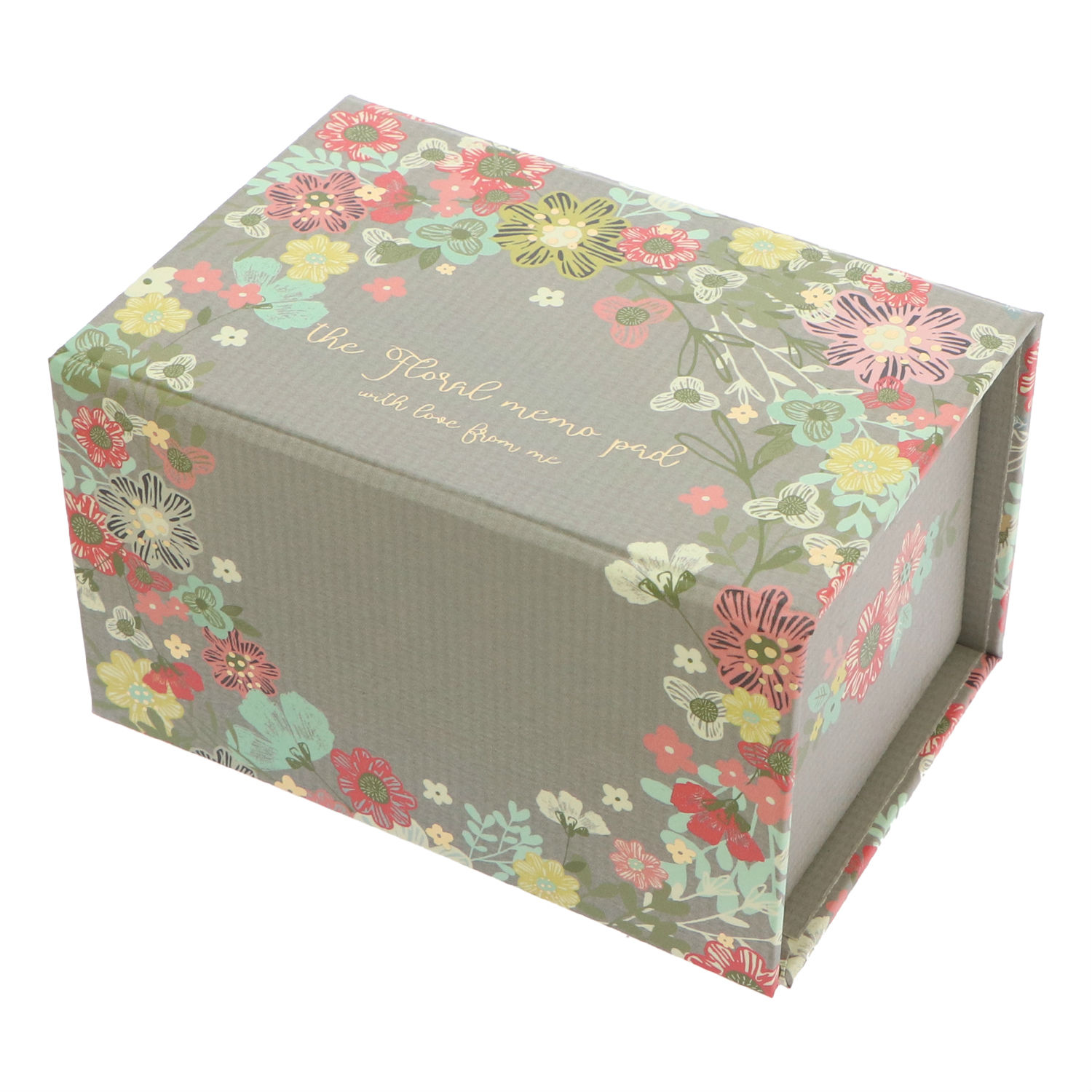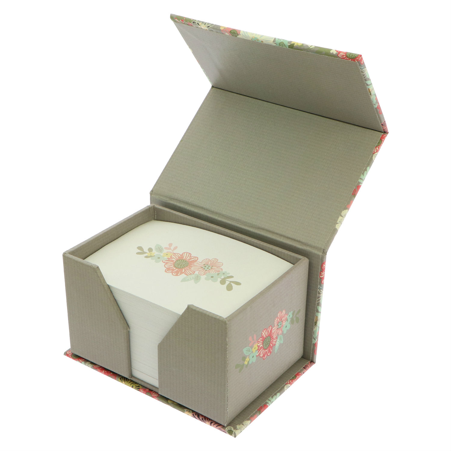 Prepare memo sheets for everyday writing needs with this memo block. This memo block includes a stack of memo sheets printed with floral patterns packed in a rigid box. The box has a flip top lid with magnetic catch and is decorated with floral patterns for a matching look.
