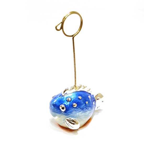 This pictured memo clip is designed with a fugu-shaped base and a metal clip. The ceramic construction allows a brilliant shine. This lovely memo clip is ideal for home and office use.