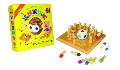 This is a game for two or more players. Stick all the pieces onto the board at the beginning. One of the players tosses a dice, finds out the color of the dice that faces up, guess which piece on the board has the same color at the bottom and pick it. If the guess is right, the player may keep the piece and has the right to toss the dice again; if not, the picked piece has to be put back to the same spot and it becomes another player’s turn to play. Repeat the process until there is no piece left on the board. Finally, the winner goes to the player who owns the most pieces.