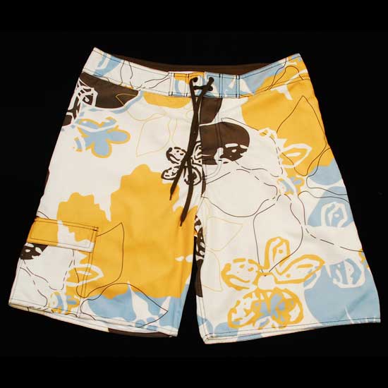 Distinctive and colorful, this pair of swim shorts features abstract floral patterns throughout. The side pockets have sturdily made hook-and-loop fasteners for secure closure. The triple stitching technique applied at the waist adds endurance and introduces extra touch and texture.