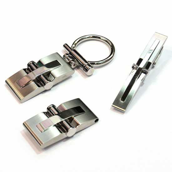 This classy men's accessories set consists of a keychain, a tie clip and a pendant, which the elegant stainless steel bars have a nice polished surface. This exquisite set adds on one's charm and is a nice gift for men.