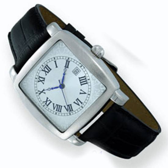 This watch reflects a classic style with the Roman numerals. It showcases a sense of modesty with a silvery square case, well assorted with the black leather-like straps. A date display is added to keep you on schedule.