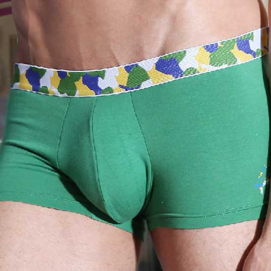 This is a pair of men's boxer shorts in allover green. The waistband is printed with colorful patterns for a unique look. The soft material offers enhanced comfort.