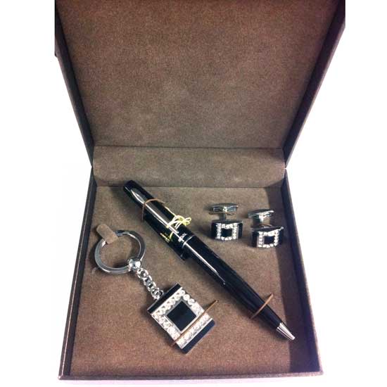 This exclusive men's business gift set includes a keychain, a pair of cuff links and a pen. Each piece of gift showcases excellent craftsmanship and tasteful design. The jewelry set is finely packaged in an exquisite gift box.