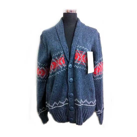 This is a men's cardigan blended 70% wool with 30% acrylic to promise enhanced comfort and durability. It features a button front closure, ribbed hems and cuffs for added style. The white and red patterns make this sweater look elegant and exquisite.