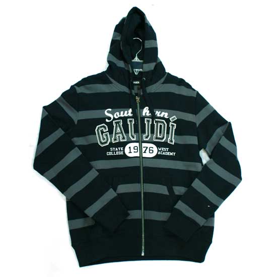 Showcased is a men’s hooded jacket coming in a casual style . The jacket looks cool with the black-and-gray striped patterns. Words are added on the chest to showcase a sporty design.