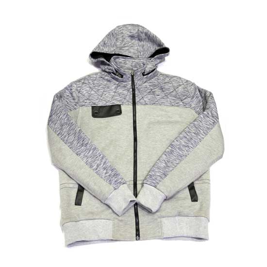This is a men's jacket boasting a fashionable two-toned design. It features a zip front closure, a stand collar, a hood and two side pockets. The cuffs and hem are made of elastic material.