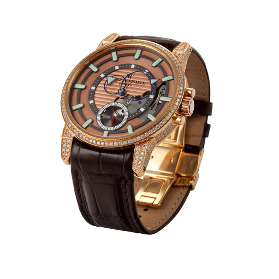 The pictured watch named Graphica is a richly profiled and stylish watch that uploads the greatest watch making traditions and is imbued with Peter Tanisman’s philosophy. It’s an object of passion whose beauty is sculpted in the red gold. Its contemporary design and generous proportions are dedicated to the masculine wrists while its global harmony transcends time with the bold understatement of a great classic. The charming ballet of its winding-movement is visible through its complex two-level dial, engraved with a distinctive ‘Cotes de Geneve’ pattern. The exclusive round hands add their harmonious arabesques and interlace according to the passing time. An open case-back also reveals the hand-finished components and exclusive decoration of its skeleton mechanical movement. 224 round brilliants underline the design of the case attachments and punctuate with subtle sophistication the male silhouette of this exceptional Graphica.