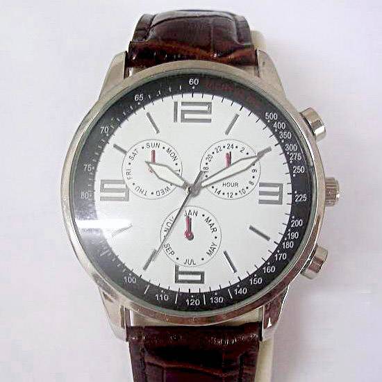 The men's analog watch features a large round dial and a sophisticated PU leather strap in dark brown. The white dial is finished with three subdials, each indicating the day, month or 24-hour time to maximize time-keeping functions. Built with an exquisite movement, it promises great accuracy for everyday use.