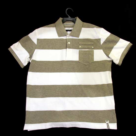 The men's polo shirt showcases fine stripe patterns in white and gray. The pocket and two straps on the chest add a decorative touch. This polo shirt has a pointed collar and a front button closure.