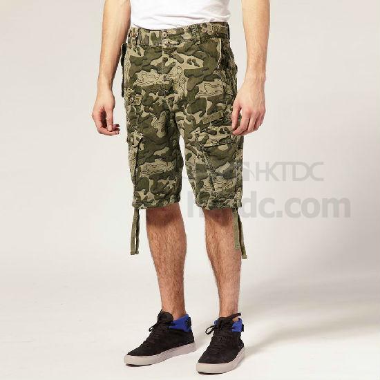 Printing cargo shorts with herringbone tape on hem.