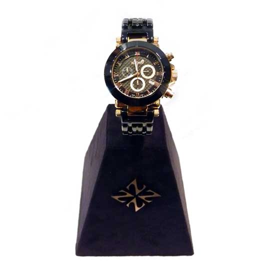 This men's quartz analog watch touts a black round bezel complemented with a crown and two push buttons in a gold tone. The date display window and three sub-dials lend extra functionality to the timepiece. This exquisite chronograph watch is completed with a black bracelet band with a polished finish.