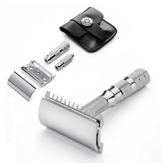 This is a men’s shaving razor made with a stainless steel structure for extra robustness. The ergonomic handle offers a firm and comfortable grip. With a pouch and some accessories, this shaving razor set is surely an ideal tool to keep men groomed easily.