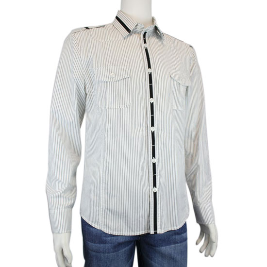 Pictured is a casual shirt made for the fashionable gentlemen. The overall striped patterns parallel with the single black stripe that run through the collar and placket. The two chest pockets add to the shirt’s smart style.