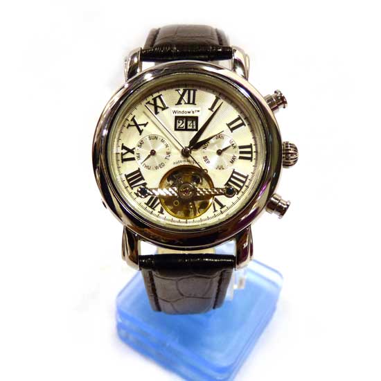 This men's skeleton watch exhibits classical elegance and style. It is designed with a silver watch case with Roman numeral markers. The skeleton detail and sub-dials exemplify delicate craftsmanship and fine taste.
