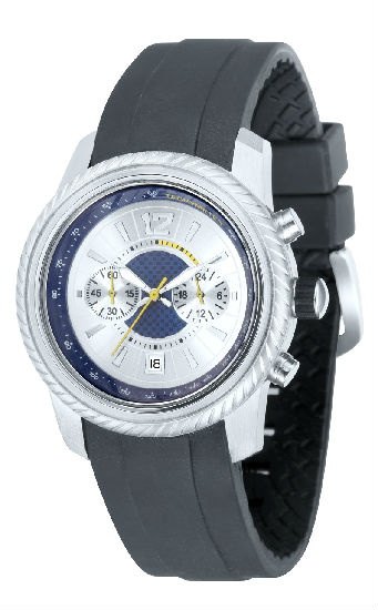 Presented is a stainless steel watch featuring a rubber strap and a silver circular dial face with a blue fixed bezel. The display dial is fully embellished with silver-toned bar shaped hour markers and a large Arabic numeral marker at twelve o’ clock position for easy-to-read functionality. This wristwatch also includes two sub dials placed at three and nine o’ clock position, in addition to a handy date calendar rested at six o’ clock position. The watch is powered by Japan chronograph movement and is water resistant up to 165 feet.