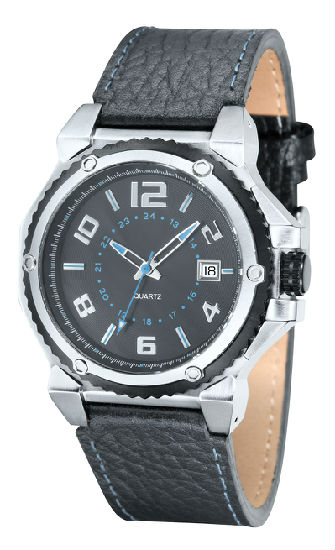 Captured is a stylish stainless steel sports watch featuring a black genuine leather strap with an adjustable clasp. Its precise three hands date movement, water resistance to 165 feet and stainless steel case have added the durability and completes the timepiece sophisticatedly. The dial is designed in a black background with blue-toned stick hour index markers and silver-toned Arabic numeral hour index markers at two, four, six, eight, ten and twelve o’ clock, and is complimented with a date display window at three o’clock position. The hour, minute and second hands and inner bar-shaped minute indices are highlighted in light blue, creating a fancy yet cool touch.