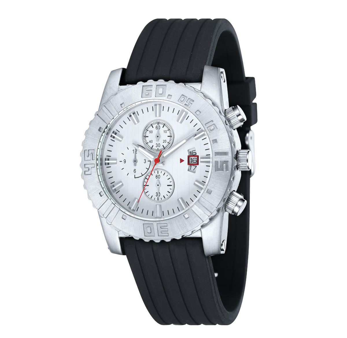 The case of this men’s sport watch is made of stainless steel with rotating bezel. It features a genuine leather strap and a sunray dial with silvery clock hands and hour markers. This quality wrist watch is designed for gallants with style.