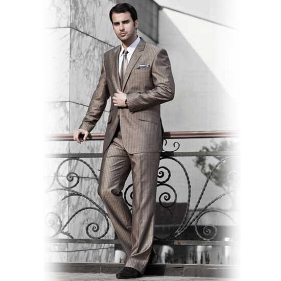 This men’s suit in light brown features vertical lines for a stylish touch. The button-front jacket comes with three pockets for users’ convenience. This classy suit is great for formal occasions.